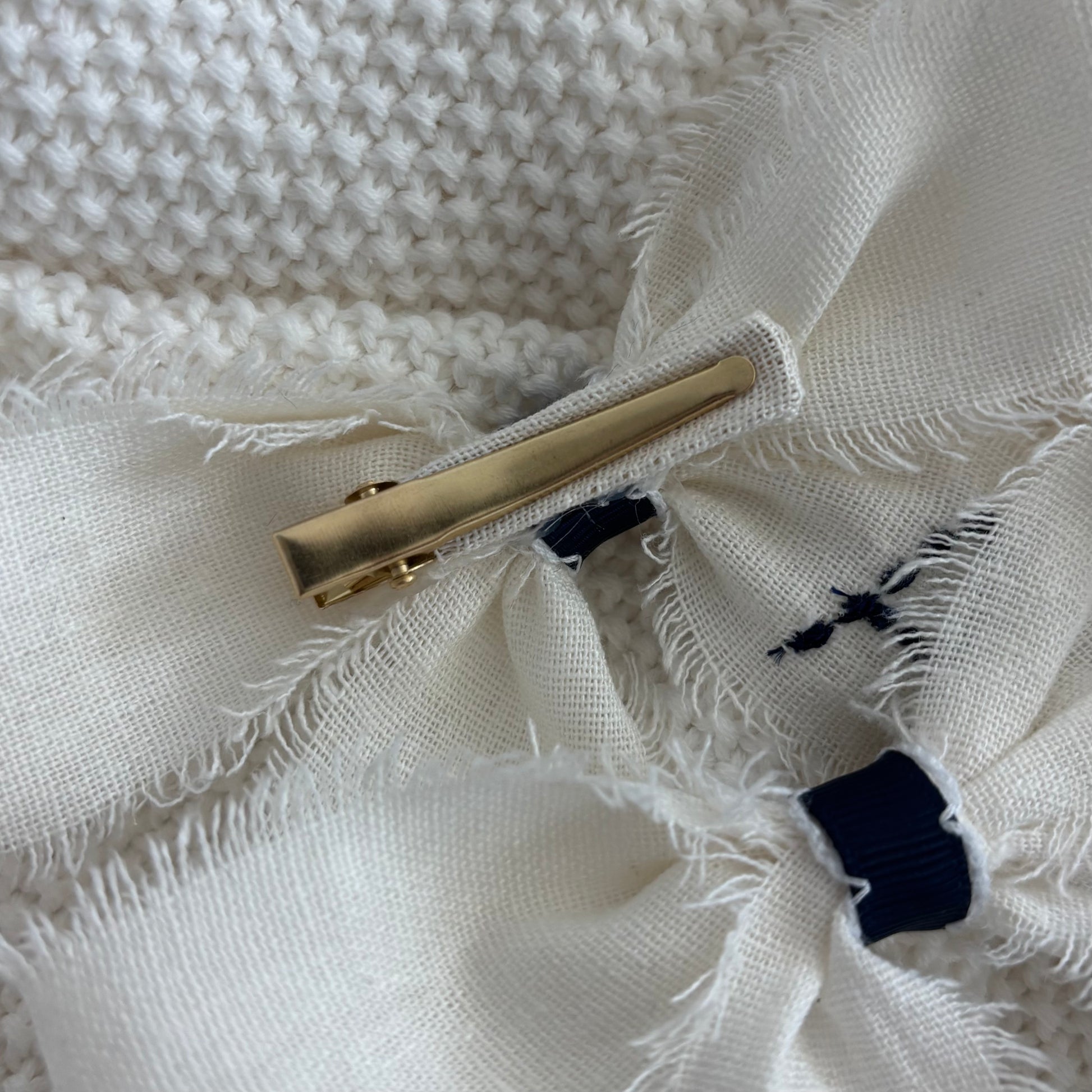 Handmade White Bow with Navy Blue Embroidery, beautifully personalized with your child’s name. Crafted from natural cotton-linen* ribbon, this bow features a soft yet durable texture and classic embroidered detailing in deep navy blue. Measuring approximately 5” x 6”, it’s the perfect accessory to make any outfit extra special while keeping a refined and elegant look. A piece designed with love and attention to detail.